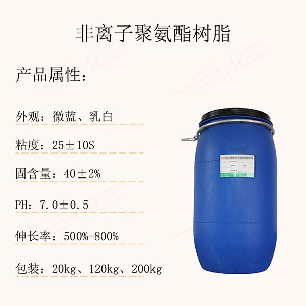 不同與陰離子和陽離子聚氨酯樹脂,采用非離子形態(tài)聚氨酯樹脂,具體環(huán)保特性,良好的水洗牢度,耐水性好,附著力好,斷裂強度大;常溫低溫,耐曲折性能好,透明度高。